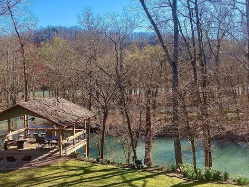 Bonney House is a Current River retreat overlooking the Bay. Cozy and decked out with fishing decor, this four-bed + one-bath apartment features a kitchenette, fireplace, grill, covered outdoor dining, and a fire pit with seating.